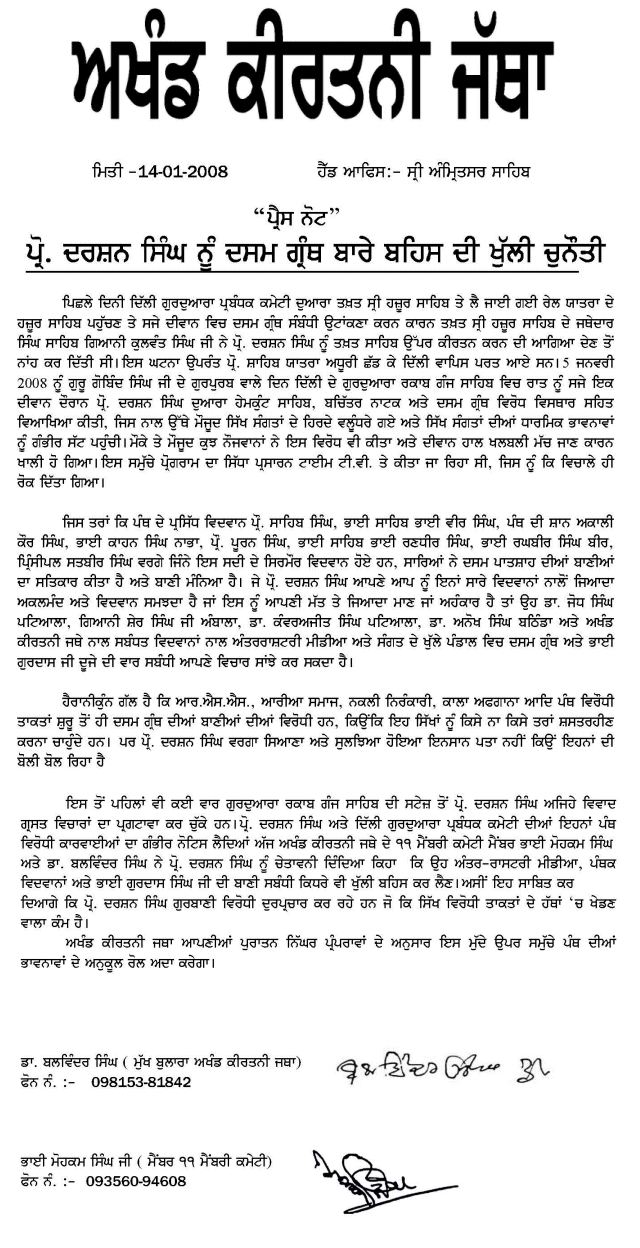 The Akhand Kirtani Jatha openly challenged Darshan Singh to a debate in front of international media on the subject of Dasam Bani and Bhai Gurdas Ji’s Bani with scholars such as Dr. Jodh Singh, Patiala, Giani Sher Singh Ambala, Dr. Kanwarajit Singh Patiala, Dr. Anokh Singh Bathinda, and scholars from the Akhand Kirtani Jatha.