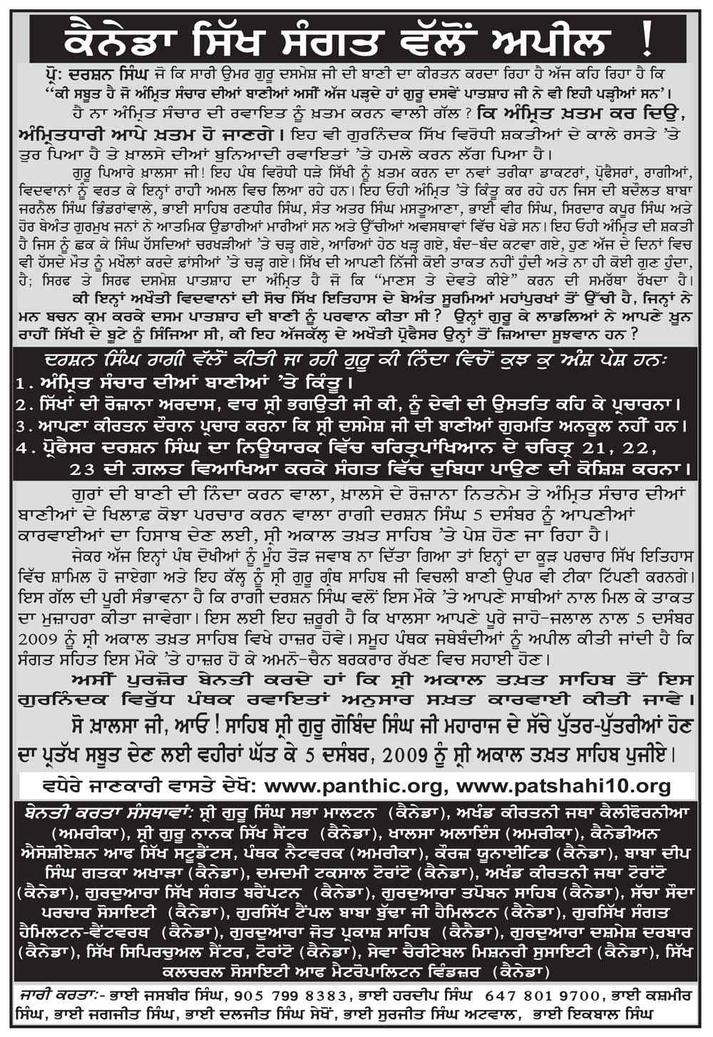 Toronto, Canada - Nearly two dozen North American Sikh organizations and Gurdwaras openly called for strict action against the heretic Ragi Darshan Singh who was summoned to Sri Akal Takht Sahib for distorting and ridiculing the Bani of Sri Guru Gobind Singh Ji.