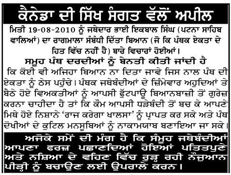 TORONTO, CANADA (KP) - Panthic organizations and Gurdwara Sahibs across North America sharply condemned the August 19th, 2010 divisive decree related to Ragmala by Jathedar Iqbal Singh of Takht Sri Panta Sahib, stating its intent was not in the spirit of Panthic unity.