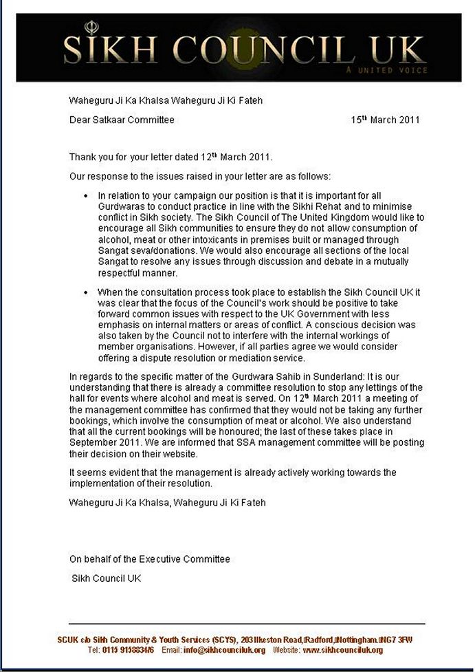 Members of the UK Sangat had objected to the violation of Sikh Maryada and Sikh ethics 6 years before. In July 2010, the Sunderland Sikh Association passed a resolution signalling their intent to stop parties at the hall, though no firm deadlines were given as to when this would take place. Further bookings had taken place since July 2010. However, after receiving requests from the UK Sangat, the Satkaar Campaign and the Sikh Council UK, the Sunderland Sikh Association committee formally passed the recent resolution confirming that no further bookings for parties at this hall will be taken. A copy of this resolution, signed by President of the Sunderland Sikh Association: